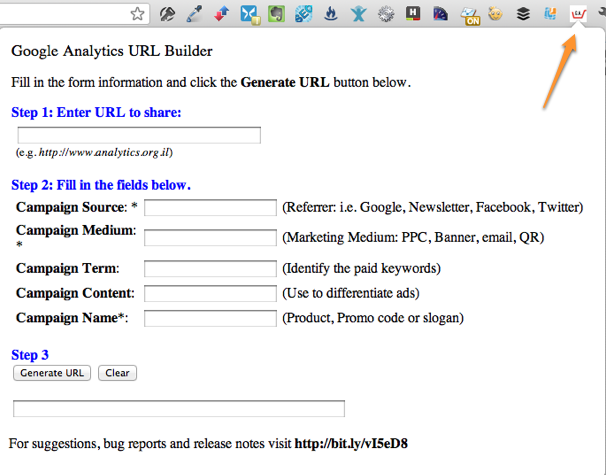 6 Manchmal will man schnell ein paar URL’s für ein Tweet oder eine Facebook-Kampagne taggen. Dafür muss man meistens bei Google vorbeischauen und den Google URL-Builder benutzen. Dies ist nicht nur nervig, sondern kostet auch sehr viel Zeit. Für dieses Problem gibt es nun eine schnelle Lösung in Form eines Google Chrome-Plug-ins. Dieser Plug-in macht nichts anderes wie Google URL-Builder, der einzige Unterschied liegt darin, dass man diesen URL-Builder direkt aus dem Browser starten kann.