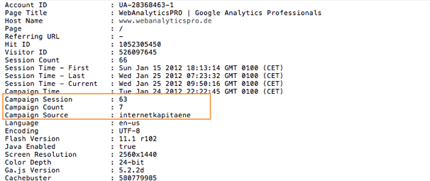 3 Seit einiger Zeit gibt es den Google Chrome Analytics Debugger für die Überprüfung des GATC’s. Dieser Debugger funktioniert direkt aus Google Chrome, das heißt, es verbindet sich mit der Chrome Developer Toolbox zusammen. Sobald dieser Plug-in aktiviert ist, werden unter dem Menüpunkt “Console” Informationen wie Account ID, Referring URL, eindeutige Visitor ID, Session Time, Campaign Source und viele weitere Daten übergeben. Für das Debugging ein absolutes “must-have” Plug-in.
