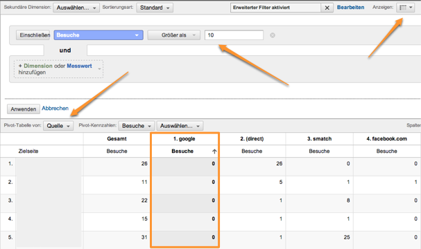 7 Google Analytics ist das ultimative Tool für alle erdenklichen Auswertungsmethoden. Damit kann man nicht nur das Besucherverhalten, die Umsatzentwicklung oder die Nutzung von mobilen Geräten auswerten, sondern auch die Indexierungsrate der eigenen Webseite bei Google checken. Die meisten SEO’s kennen diesen Befehl “site:domain.de” für die Prüfung der Unterseiten, die bei Google im Index aufgenommen worden sind. Mit diesem Befehl kann man lediglich die Anzahl der indexierten Unterseiten prüfen und nicht die Effektivität dieser Seiten im Hinblick auf die Traffic-Generierung. Für dieses Problem bietet Google Analytics eine einfache aber sehr effiziente Lösung. Mit Google Analytics kann man nämlich alle Unterseiten anzeigen lassen, die keine Besucher von Google in dem gewählten Zeitraum erhalten haben. Mit der sogenannten Pivot-Tabelle in der Version v5 kann man Zielseiten den dazugehörigen Quellen gegenüberstellen und somit die Unterseiten mit 0 Besuchen identifizieren. Demnach kann man sogar ein Verhältnis bzw. Effektivitätsgrad errechnen: 1 – (Anzahl der Zielseiten ohne Google-Traffic / Anzahl der Seiten mit Google-Traffic) = 1-(10 / 26)= 0,62. Je höher der Grad desto besser ist die SEO-Performance.