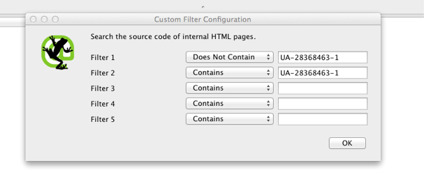 2 Nachdem SiteScan von Lunametrics abgeschaltet worden ist, gibt es keine kostenlose Möglichkeit mehr, die Implementierung des Tracking-Codes auf allen Unterseiten zu checken. Vor einem Monat hat State of Search einen interessanten Artikel veröffentlicht, hier wird genau diese Problemstellung beschrieben und mit einen innovativen Lösungsansatz verknüpft. Demzufolge kann der Google Analytics Tracking Code (GATC) mit Screaming SEO Frog Spider Software geprüft werden. Diese Methode funktioniert erstaunlich einfach. Bei den Einstellungen (Configuration) auf Custom gehen und dort für den Filter 1 “does not contain: UA-XXXXXXX-1” und beim Filter 2 “contain: UA-XXXXXXX-1” eintragen, danach die komplette Seite spidern lassen und in der Navigation unter Custom den ersten oder den zweiten Filter auswählen. Wenn beim ersten Filter irgendwelche Unterseiten auftauchen, dann ist die Implementierung womöglich fehlerhaft verlaufen, hier sollte das IT-Team ein Auge darauf werfen und diese Fehler beseitigen.