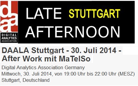 Nach dem erfolgreichen Event im Frühling findet der Digital Analytics Association Late Afternoon – DAALA – wieder statt. Dieses Mal unter dem Motto „After Work mit MaTelSo“. In Stuttgart findet die DAALA am Mittwoch, dem 30. Juli 2014, in den Räumen der Firma Netformic GmbH statt.